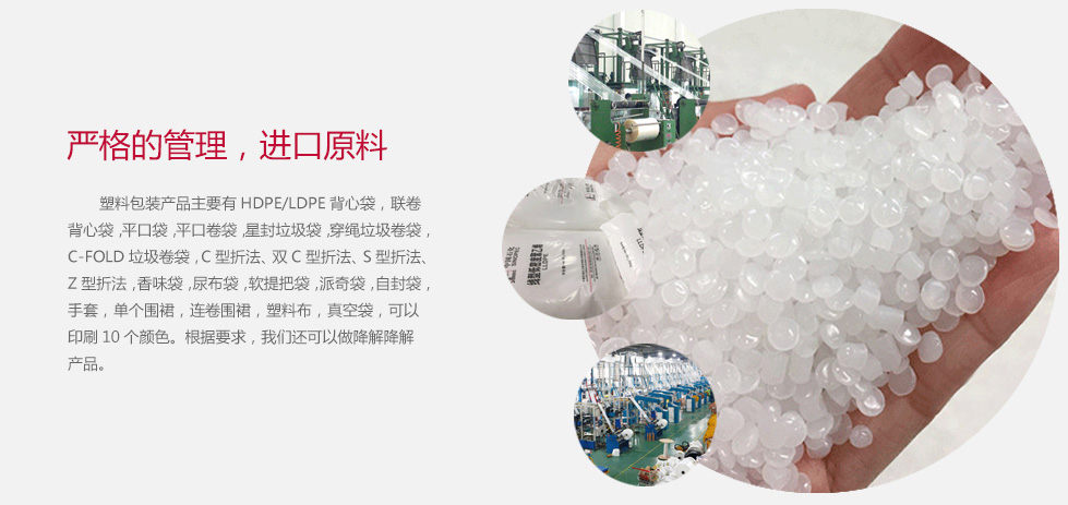 塑料包裝產(chǎn)品主要有HDPE/LDPE背心袋,聯(lián)卷背心袋,平口袋,平口卷袋,星封垃圾袋,穿繩垃圾卷袋,C-FOLD垃圾卷袋,C型折法、雙C型折法、S型折法、Z型折法,香味袋,尿布袋,軟提把袋,派奇袋,自封袋,手套,單個(gè)圍裙,連卷圍裙,塑料布,真空袋,可以印刷10個(gè)顏色。根據(jù)要求,我們還可以做降解產(chǎn)品。